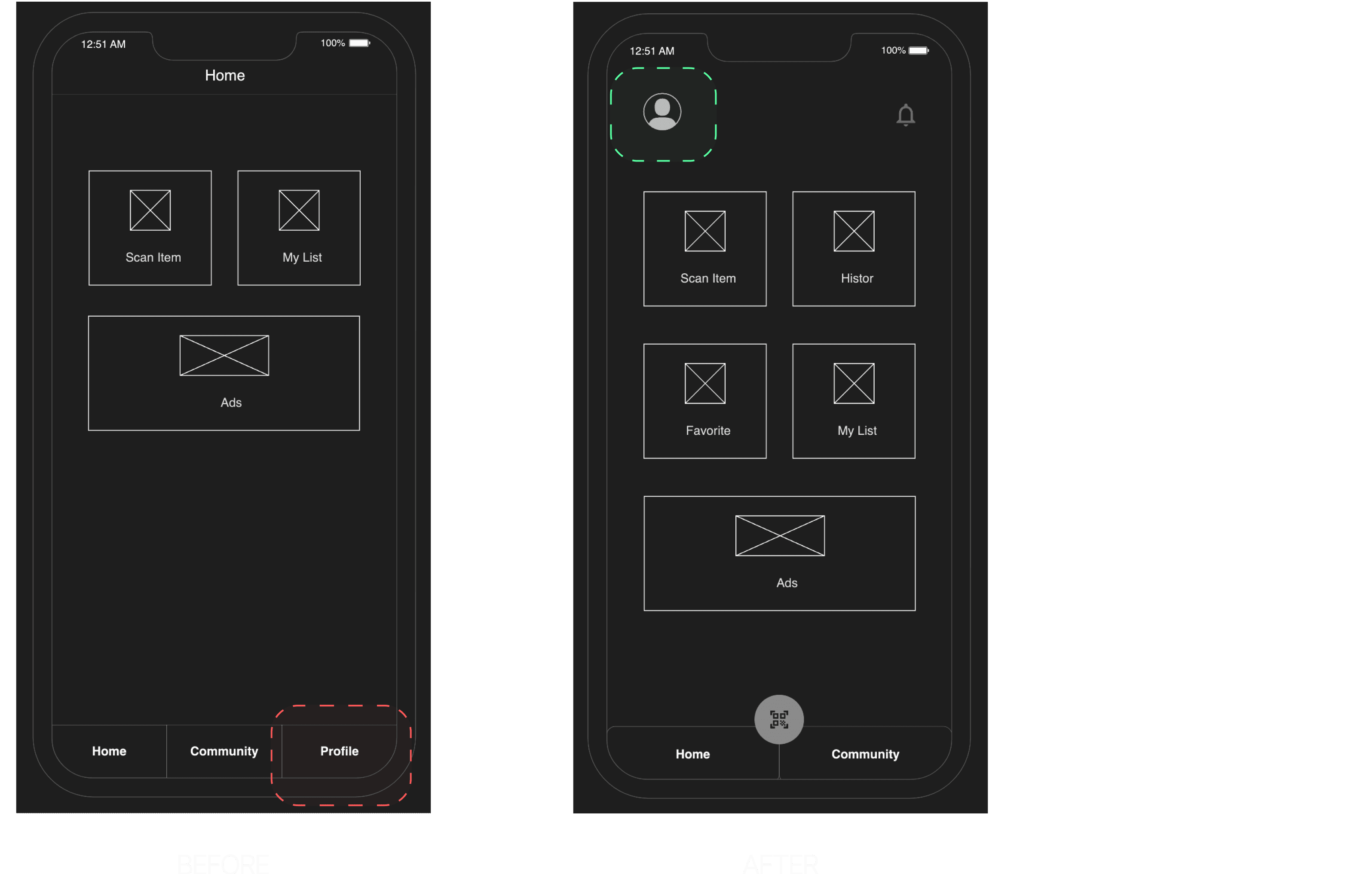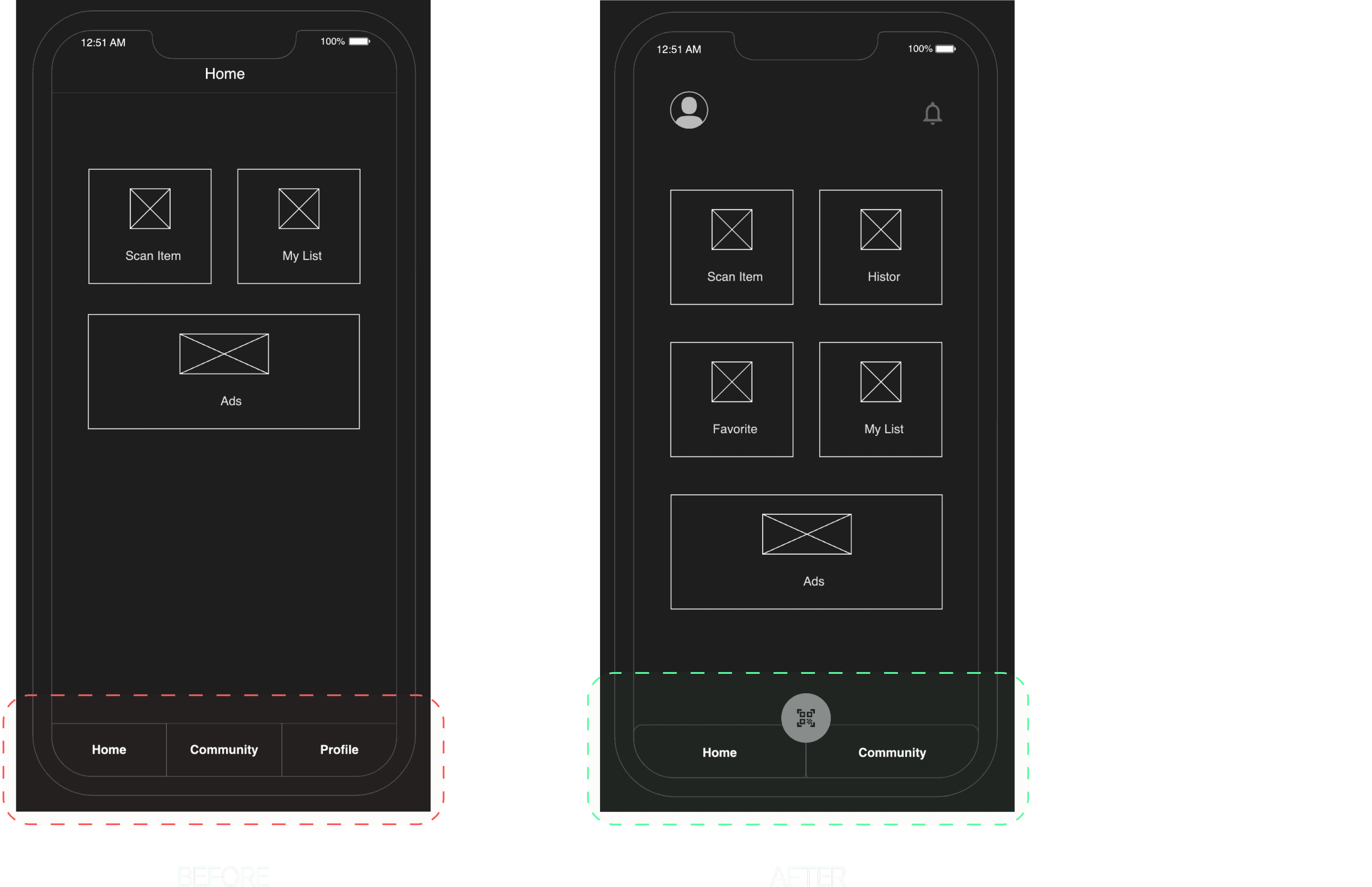 Users found the multi-tab pages cumbersome for quick scanning, often needing to return to the homepage to access the main feature. To solve this, I updated the design to a 2-tab system, making it easier to scan items. The scan icon was moved to the center for easy access, resulting in a 65% increase in user interaction.