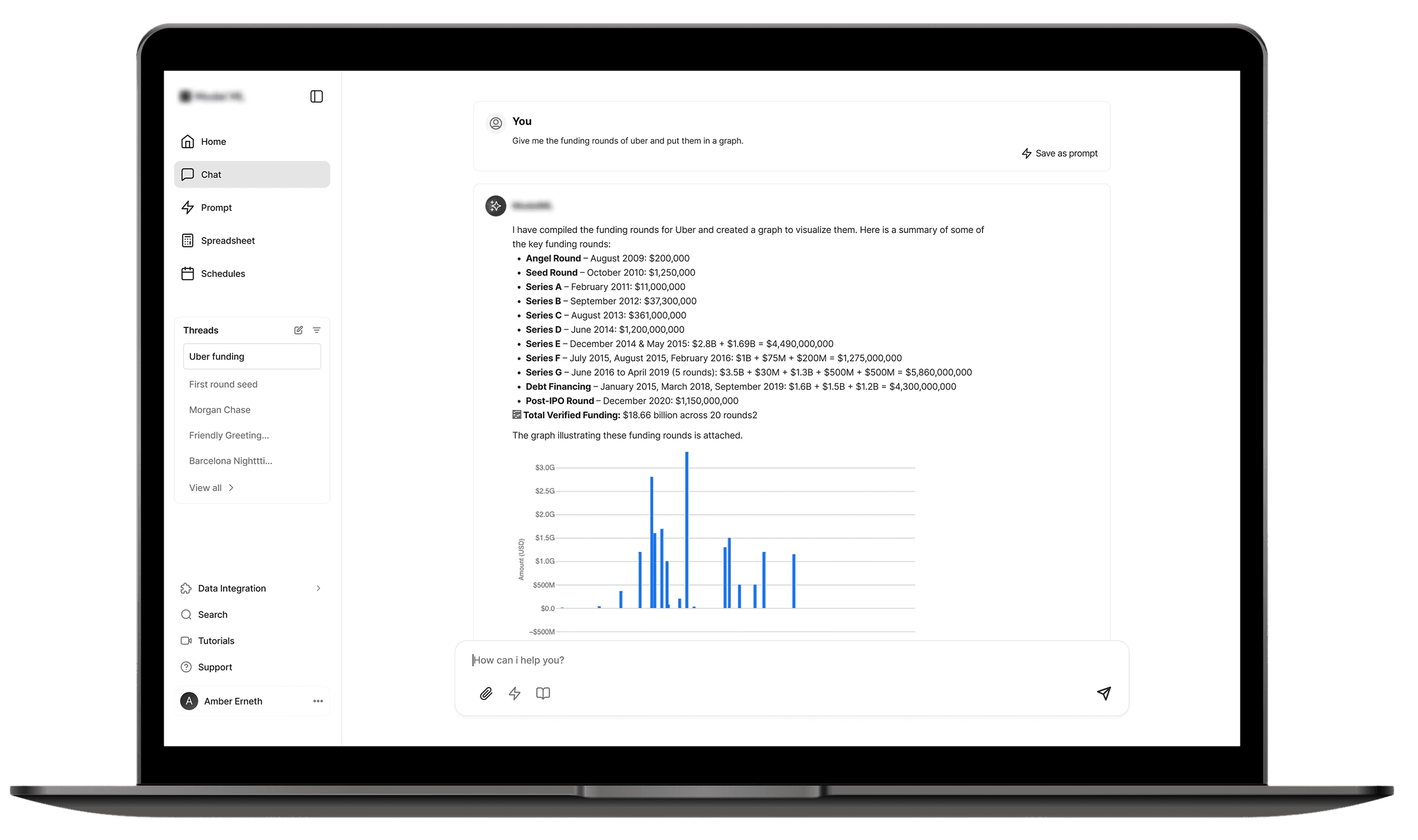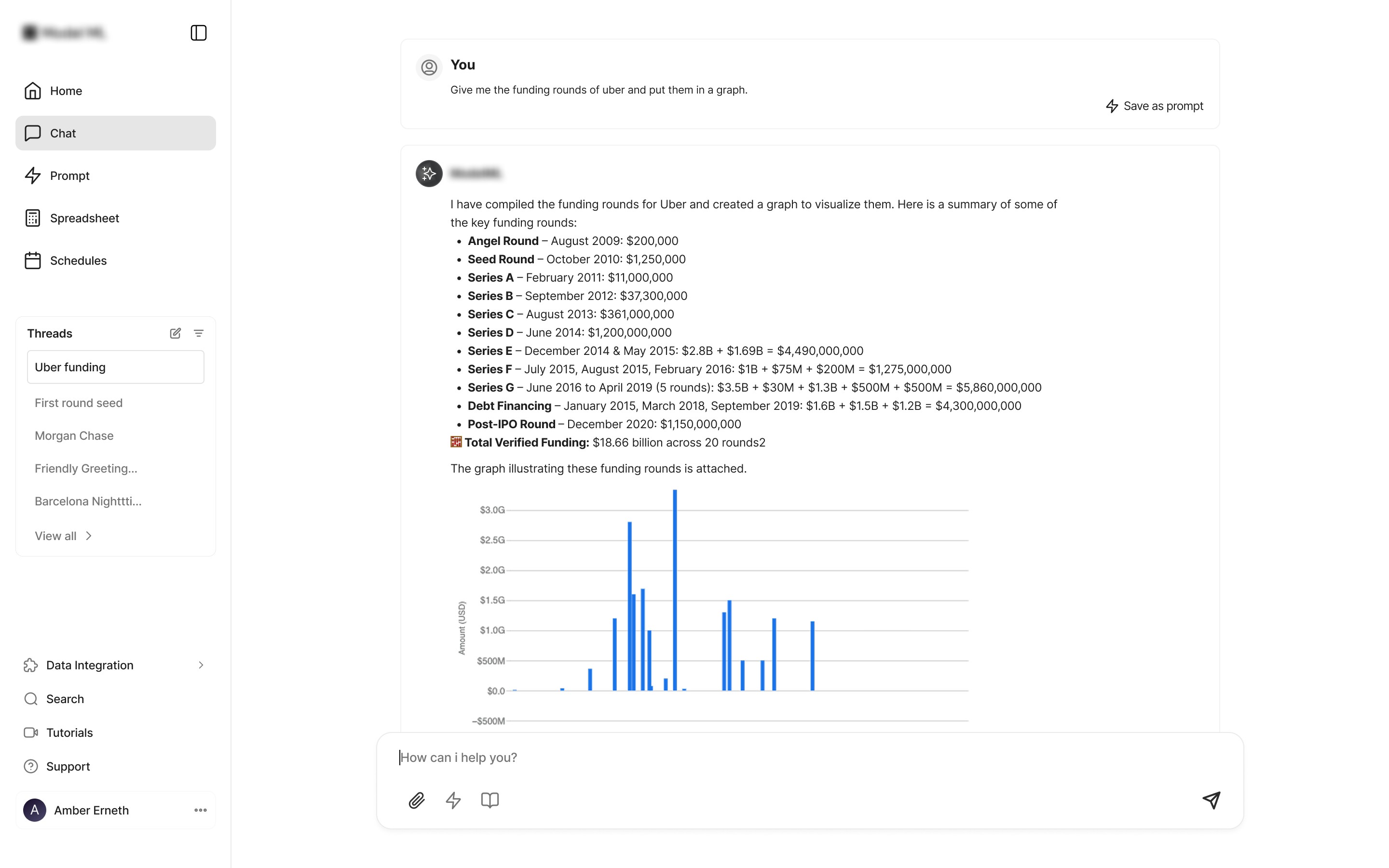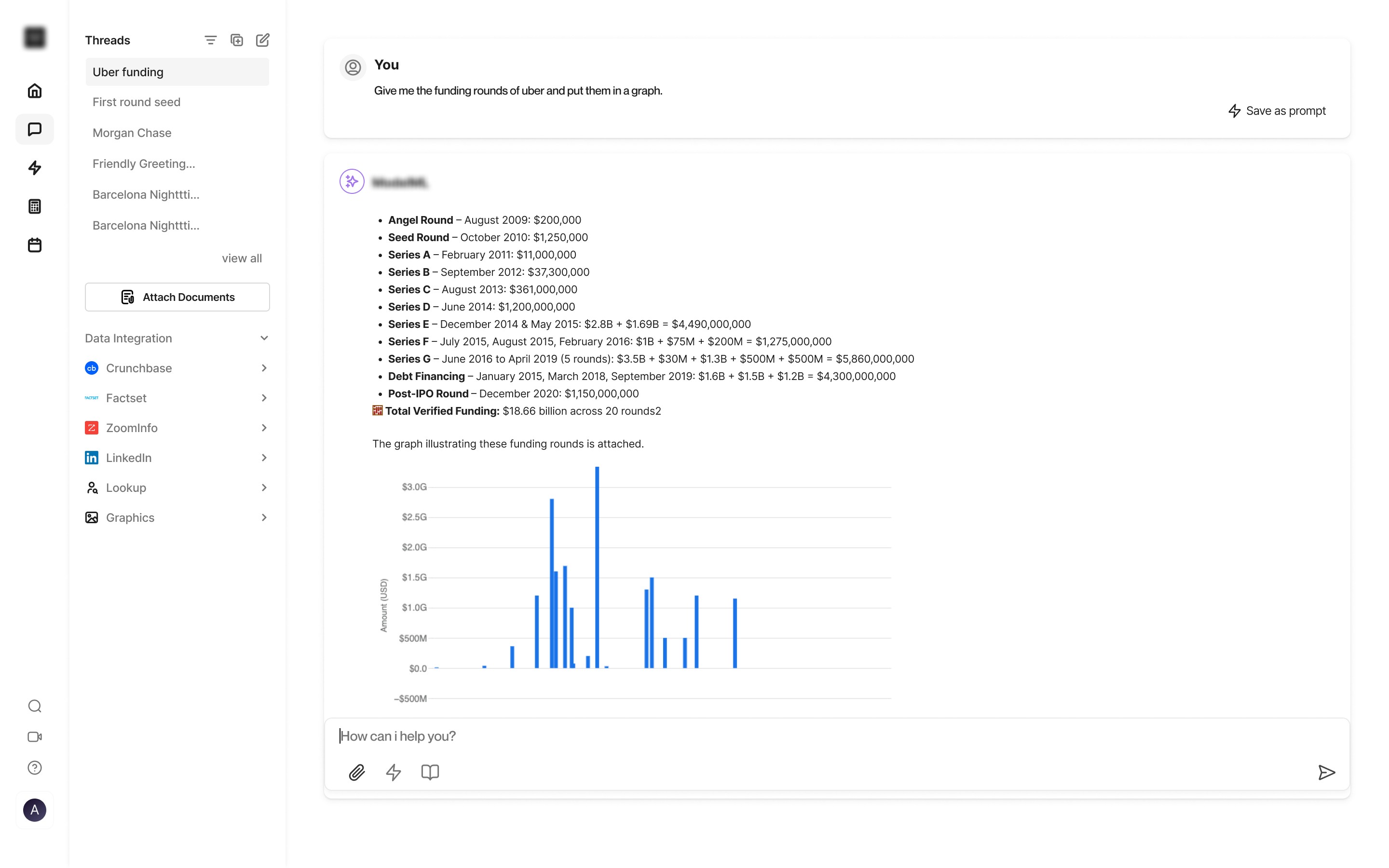 An AI platform like ChatGPT, users query data from their content and external sources such as Crunchbase. Users leverage the chat interface to interact with the AI, ask questions, and derive insights, often requiring the AI to access their own documents or specialized external tools. This project focused on a key area of the Model AI experience: the core chat page called Threads.