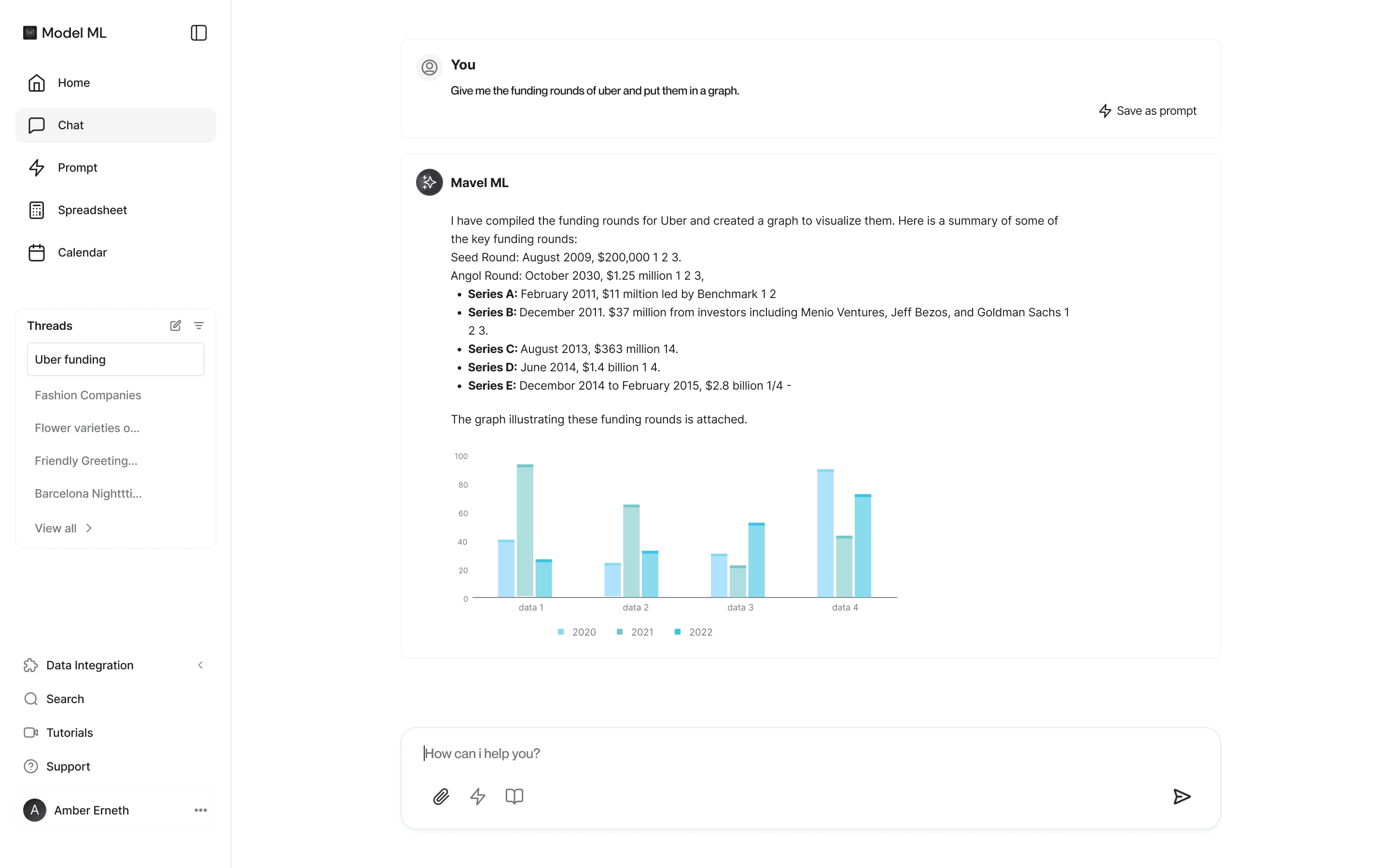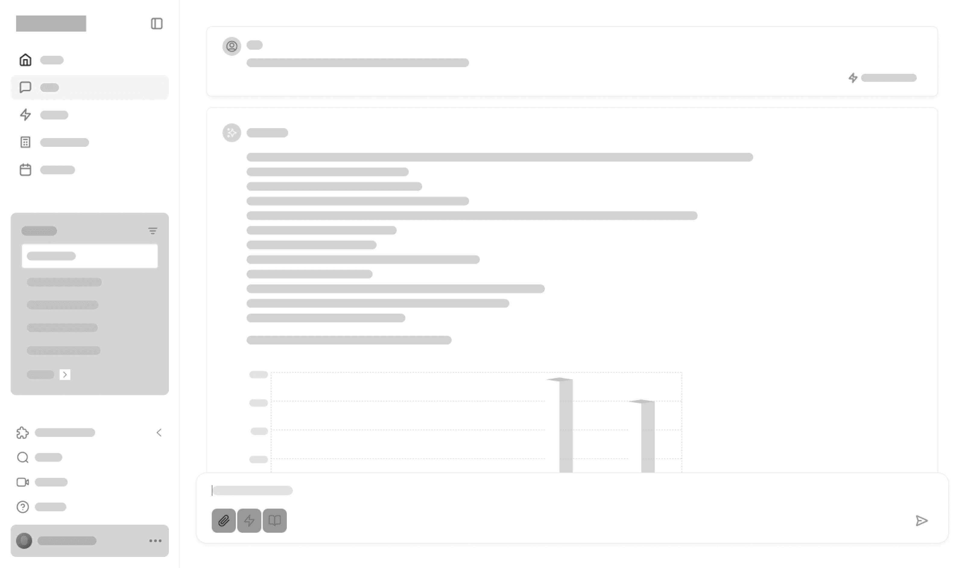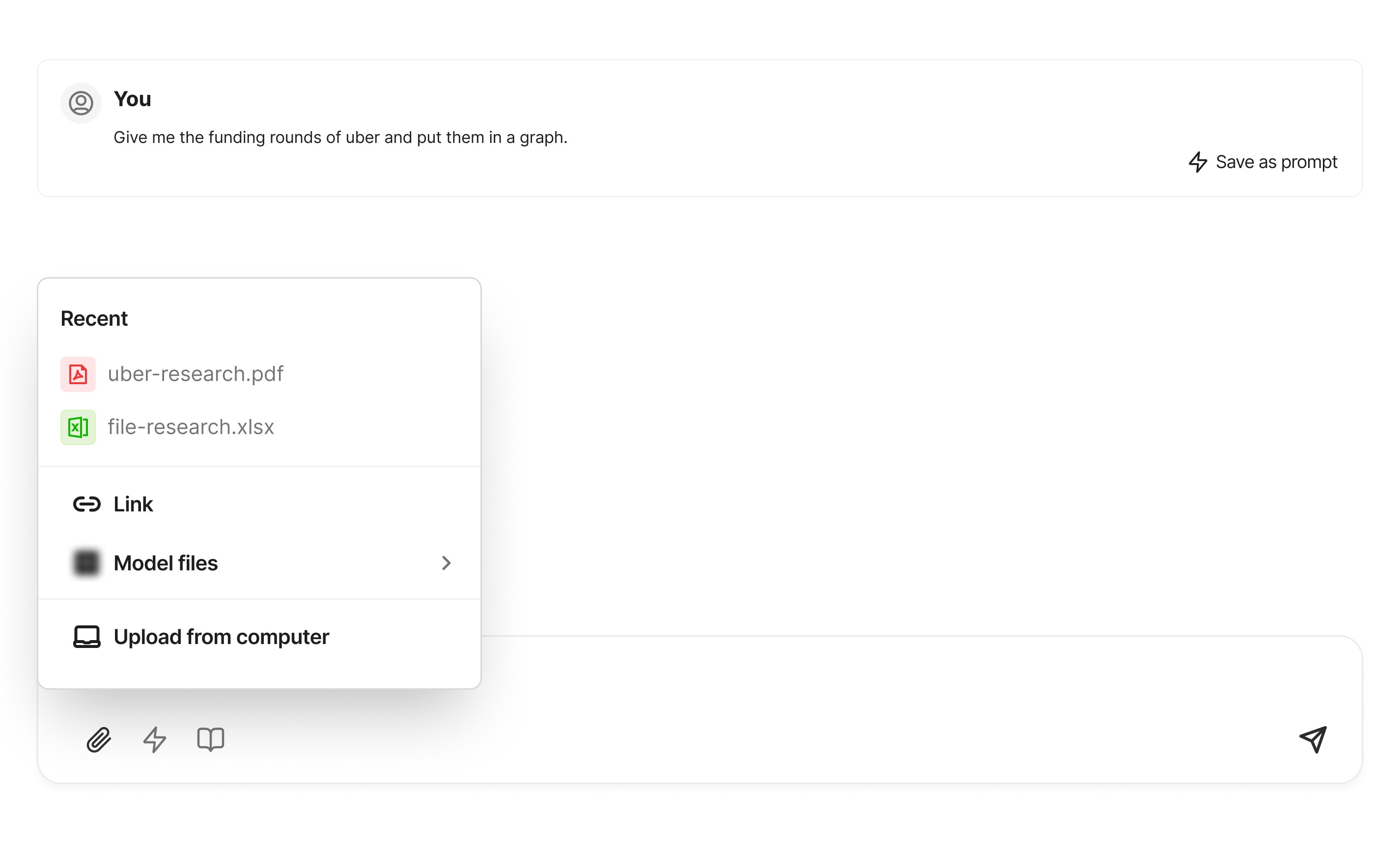 An AI platform like ChatGPT, users query data from their content and external sources such as Crunchbase. Users leverage the chat interface to interact with the AI, ask questions, and derive insights, often requiring the AI to access their own documents or specialized external tools. This project focused on a key area of the Model AI experience: the core chat page called Threads.